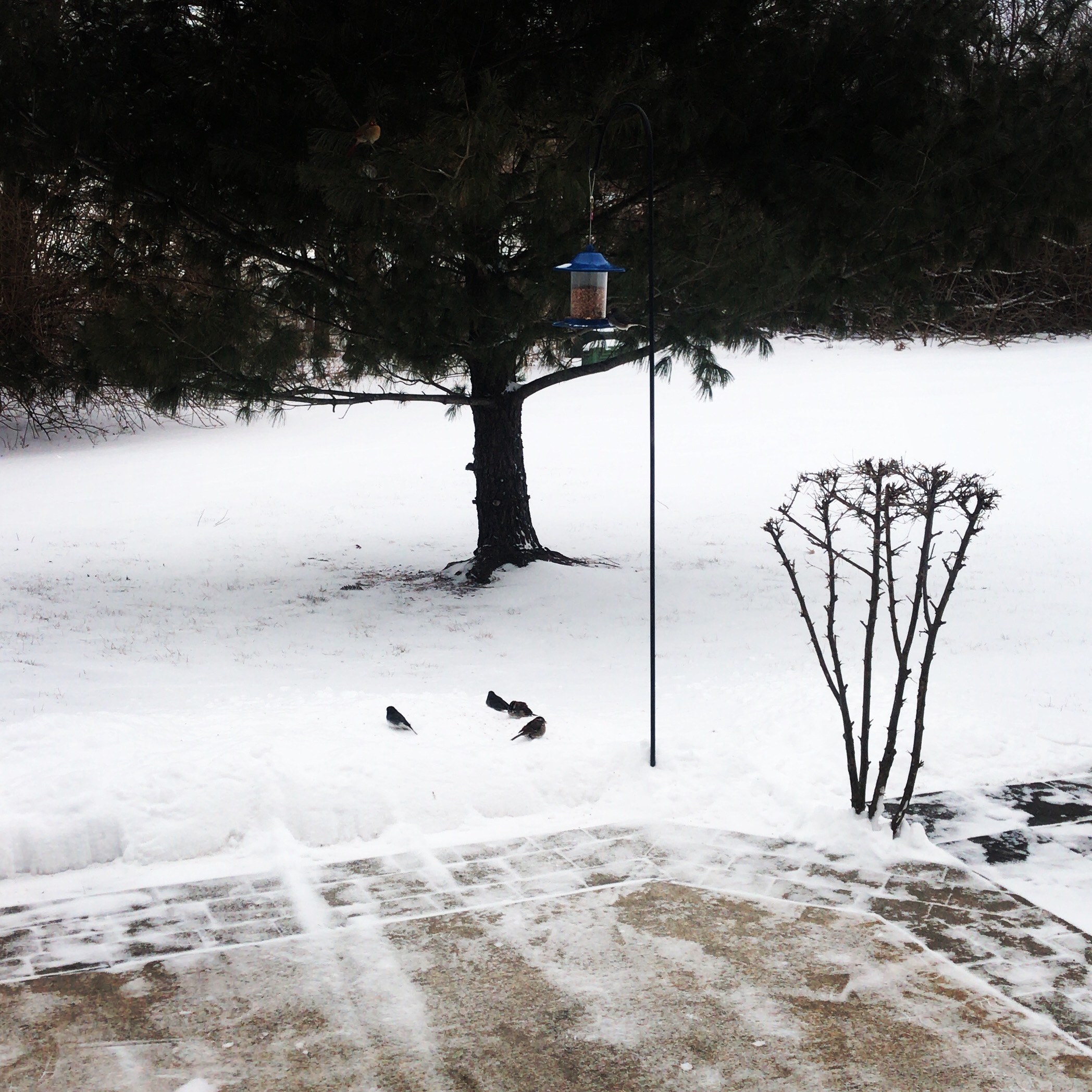 The Bible tells us to study the birds, what amazes me about birds is that no matter the season they are the same. It’s -8 degrees outside and once I shoveled and put food in the feeder they were there immediately for breakfast was served. They didn’t pound on the window demanding food, they waited in the tree as I shoveled and watched as I went in to warm up and continued to wait as I poured the seed in their feeder. Now as you can see they are enjoying what they’ve been given.