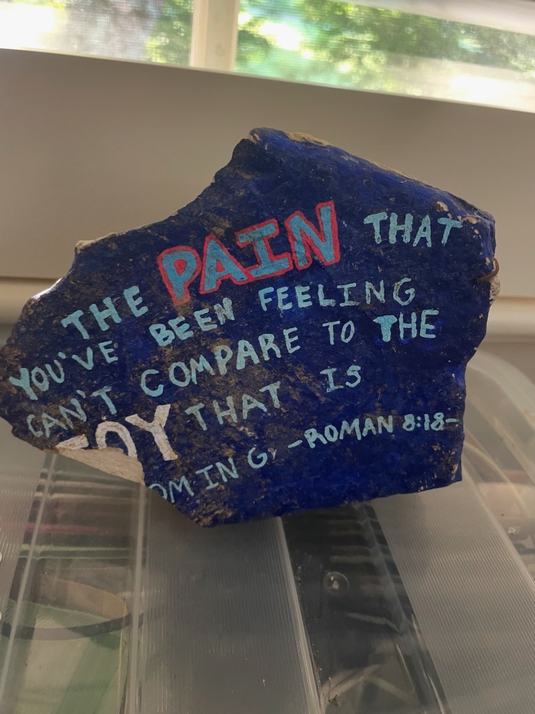 The rock said, “The pain that you’ve been feeling can’t compare to the joy that is coming. Romans 8:18.” I grabbed that rock and knew it was a word of encouragement for me and added value to the praise I was giving to the Lord for the challenge I have been facing.