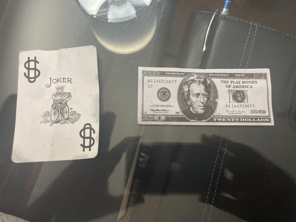 The first piece I found was a Joker playing card while on a walk. This was a couple days ago, then this morning I found a piece of paper money printed as a $20 bill that says, The Play Money of America.” I pick it up and am looking at it and the Holy Spirit reminds me of a dream I had last year of standing being a man who was sitting at a poker table and the man was holding four aces.